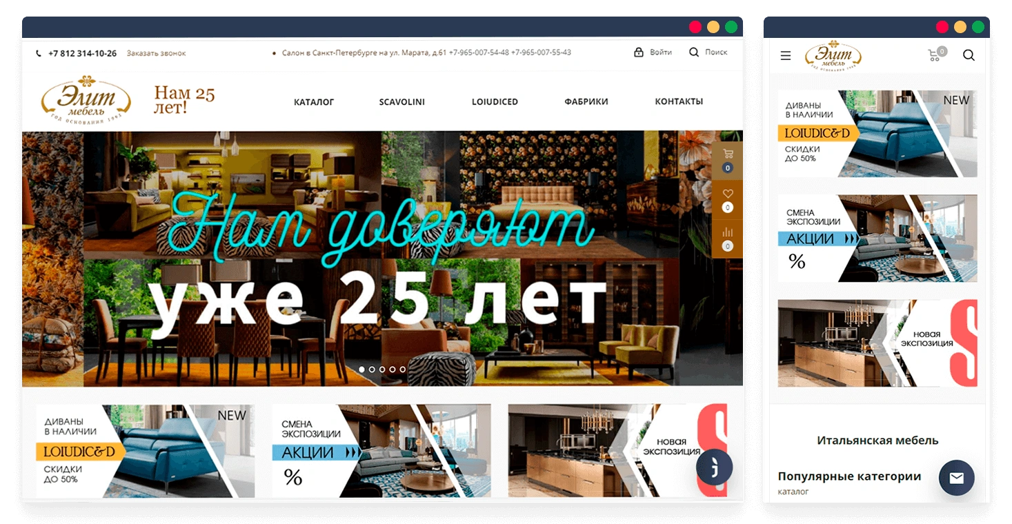 Сделали уникальный дизайн сайта, придали ему уже узнаваемый стиль. На главной странице реализовали большие и яркие баннеры с интерьерной мебелью. Сразу под баннерами разместили актуальные акции, популярные категории и последние публикации из блога компани
